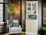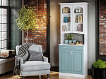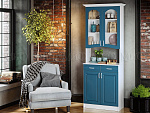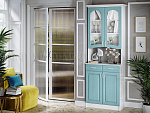 Комбинированная внутренняя организация: верхняя зона со стеклянными дверцами для демонстрации посуды; нижняя — с глухими створками для хранения бытовых предметов.