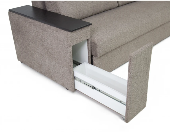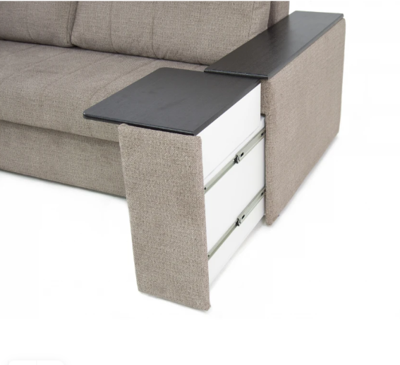 Выдвижной столик в подлокотнике — позволяет использовать диван для работы с ноутбуком или для отдыха с чашечкой чая. Выдвижной ящик в подлокотнике — для хранения всех необходимых под рукой мелочей. Бельевой ящик находится в выдвижной части в модуле дивана.