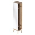 Справа от зеркала, фасад украшен белоснежной планкой из МДФ. Корпус шкафа выполнен из ЛДСП цвета натурального дерева, высокие стильные опоры - из массива березы. Шкаф идеально сочетается с шкафом Калгари двухстворчатым для прихожей, всеми комодами Калгари, а также тумбой для прихожей Калгари с двумя ящиками и с вешалкой Калгари.