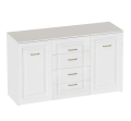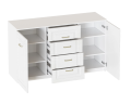 Комод выполнен в цвете Айс 06 / Белый Аляска. Классическая фрезеровка фасадов и ручки-скобы из брашированного золота придают изделию особый шарм и элегантность. Комод с полупроходными боками, прямоугольной крышкой и дном. Внутри пространство разделено на три секции. В средней секции расположены 4 ящика на шариковых направляющих без доводчика, крайние секции закрыты распашными дверями на петлях с доводчиком, за которыми расположены съемные полки. Дно и задние стенки выполнены из ХДФ. На опорах размещены войлочные подпятники.