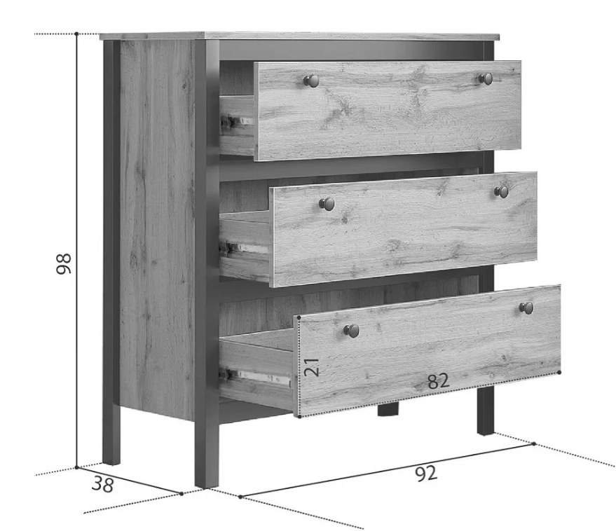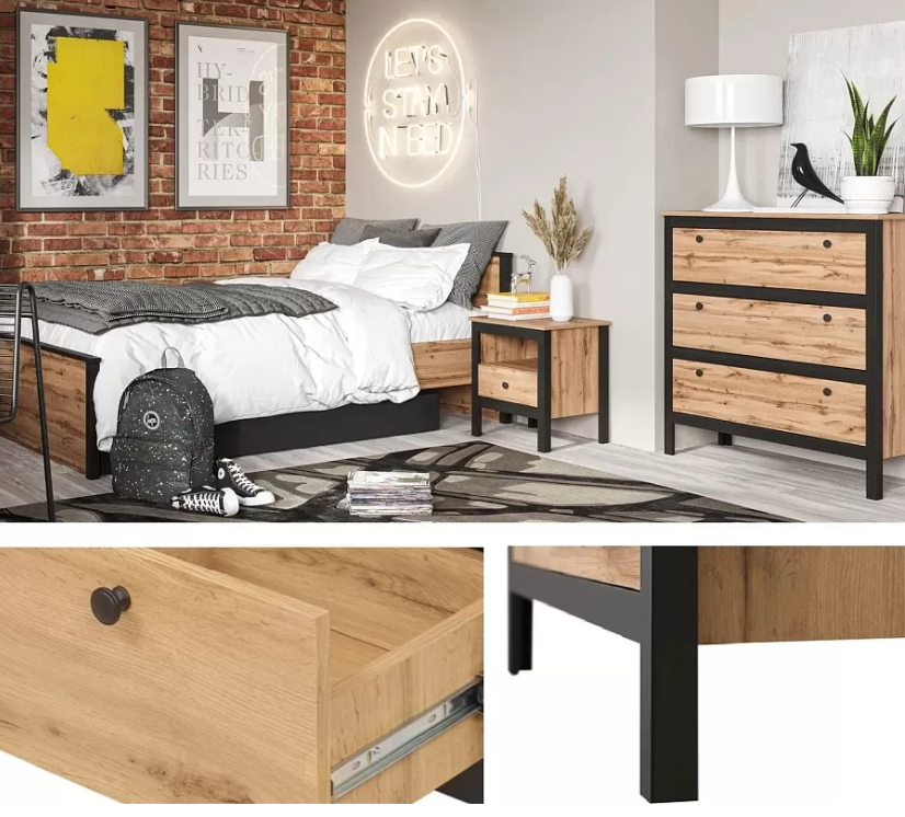 Брутальный, стильный, харизматичный. Комод Loft производителя Black Red White наглядно демонстрирует все эти качества и удивляет пропорциональностью каждой детали. Созданный руками белорусских мастеров, он представляет собой соразмерную конструкцию из трех расположенных друг под другом ящиков. Ее высота составляет 98 см, а полезная ширина ‑ 92 см. Комод с такими размерами легко заменит шкаф и поможет навести порядок в комнате.