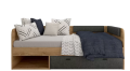 Конструкция кровати-тахты содержит одно открытое отделение и два бельевых ящика. Для удобства их выдвижения установлены удобные ручки. В открытой полке можно хранить телефон, будильник и любые личные вещи. Весомым преимуществом этой модели является возможность совмещать функции тахты, кровати и системы хранения.