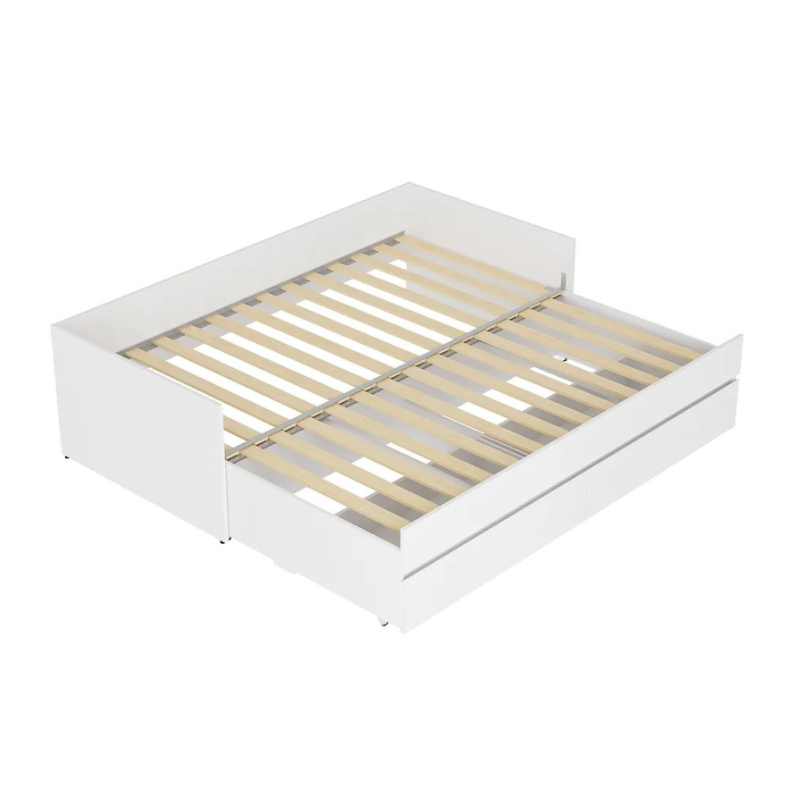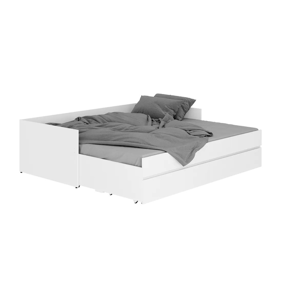 Кровать-трансформер из коллекции "Симпл" - это практичная и комфортная модель для современной спальни. Простой и стильный дизайн покорит ценителей минимализма. Данная модель удобна в использовании в небольших помещениях - при необходимости ее можно раздвинуть и получить дополнительное спальное место. Кровать оснащена выкатными ящиками, в которых легко размещается постельное белье, текстиль и другие вещи, которым не нашлось места в шкафу. Спальное место: 924*2000, в разложенном виде: 1800*2000. Основание для кровати в комплекте - ламели для раздвижных кроватей.