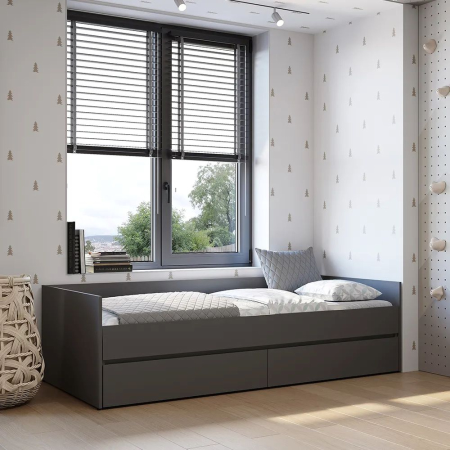 К данной модели кровати можно отдельно приобрести матрас-трансформер. «Симпл» - это современная коллекция функциональной мебели. В ней собраны все необходимые предметы для интерьера спальни, гостиной, детской комнаты, прихожей: шкафы, кровати, комоды, столы, тумбы. Коллекция полностью соответствует своему названию. Простой и стильный дизайн покорит ценителей минимализма. Отсутствует лицевая фурнитура. Мебель, выполненная в спокойных оттенках «белый» и «графит», идеально дополнит как классический, так и современный интерьер. Полноценный набор мебели позволяет экспериментировать с пространством.