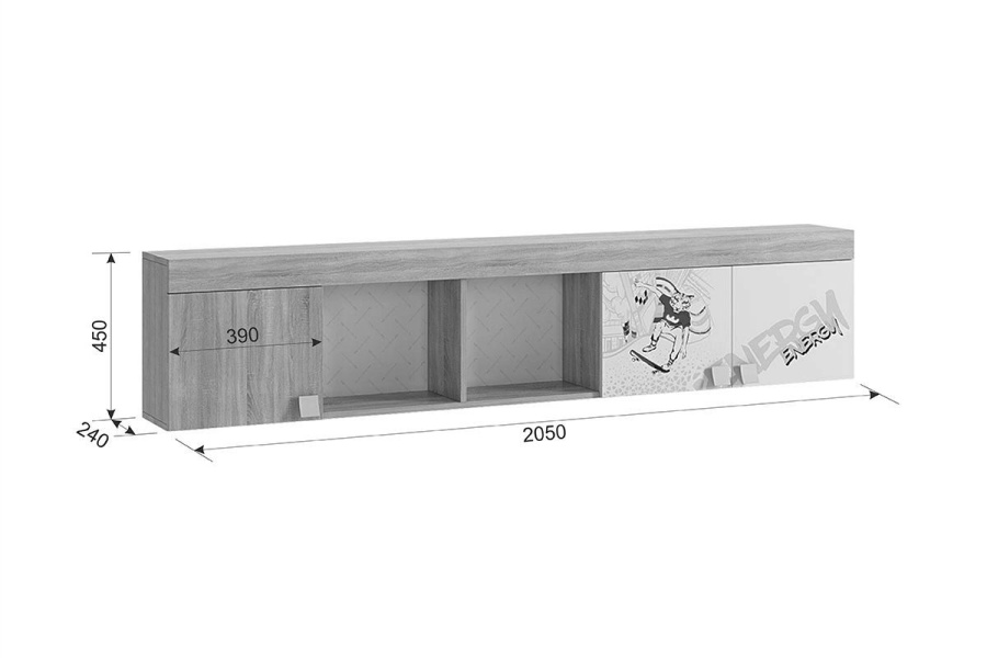 В закрытые шкафы и открытые ниши поместятся все учебники книги и сувениры. Эффектный принтерный рисунок на фасадах выдержан в общем стилистическом решении. Рисунок устойчив к истиранию и ультрафиолету. Можно повесить между шкафов над софой или использовать как самостоятельное изделие.