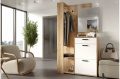 Дизайн прихожей сочетает в себе теплый, «деревянный» корпус из ЛДСП «Дуб Делано», белые матовые фасады обувницы и черную матовую лицевую фурнитуру.