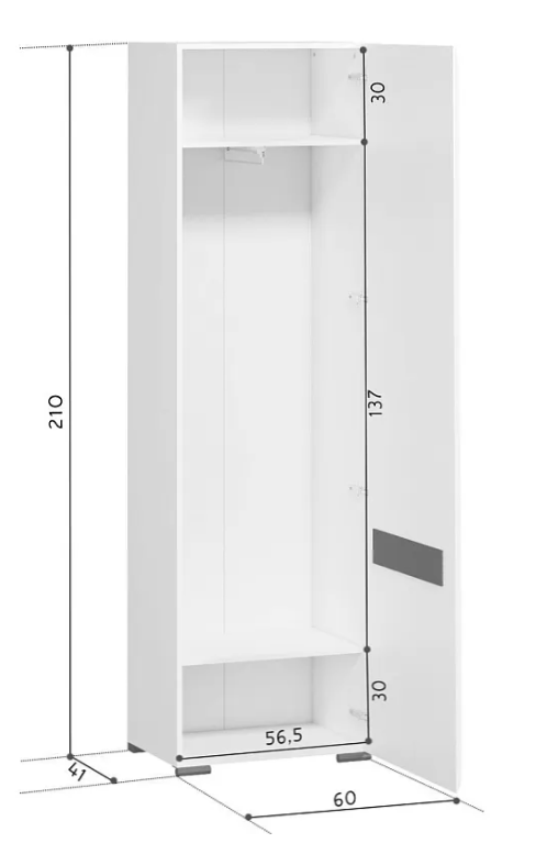 Это узкая модель на ножках с одной распашной дверью и глухими фасадами. Для достижения высокой вместительности производитель максимально использовал высоту и довел ее до 210 см. Модель имеет небольшую ширину (60 см), но даже при таких параметрах она создаст комфортную зону для хранения вещей.