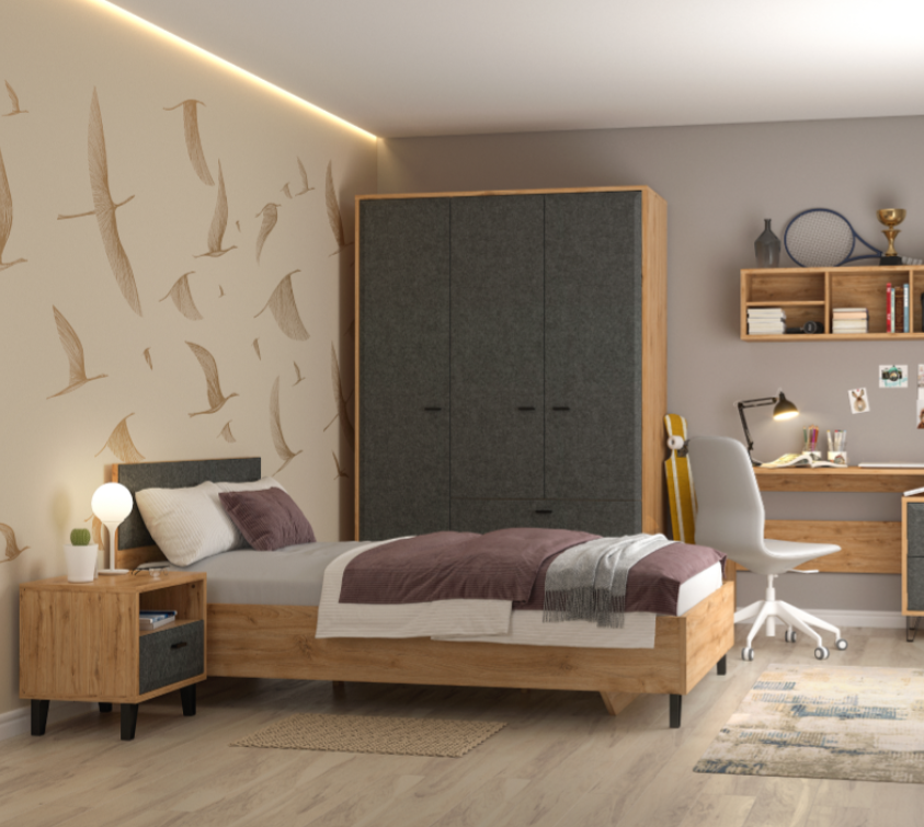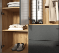 Дверцы напольного шкафа Grace имеют разную высоту и смотрятся экстраординарно. На фоне легкого коричневого оттенка каркаса и выразительного орнамента дуба графитовые фасады выглядят особенно привлекательно. В такой фактурной отделке эта модель гармонично дополнит современный стиль и любую жилую комнату, будь то спальня, прихожая или гостиная.