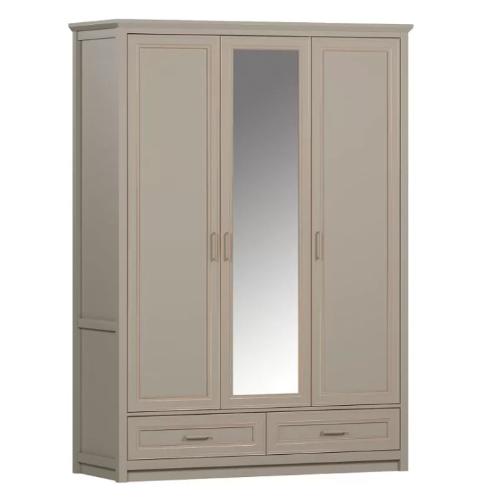 Трехдверный шкаф глиняно-серого цвета Classic с матовым покрытием предупреждает быстрое загрязнение поверхности. За ней легко ухаживать: не требуются частые уборки и специальные средства. Фасады шкафа имеют шикарный вид, дополненный эффектным золочением, высокими ножками и ручками под медь.