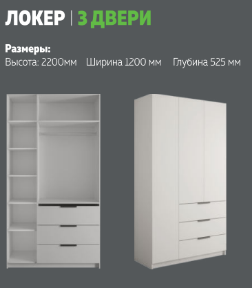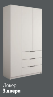 Локер — вместительный шкаф отличающийся своей компактностью и легкой установкой. Благодаря надежным полкодержателям - штифтам, полки шкафа могут выдерживать до 15 кг. Шкаф оснащен долговечной, ударостойкой кромкой ПВХ, которая защищает его торцы от сколов и повреждений.