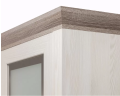 Шкаф разделен на 2 отделения: отделение со стеклянными полками за распашной дверью со стеклянной вставкой и отделение с полками за распашной глухой дверью;