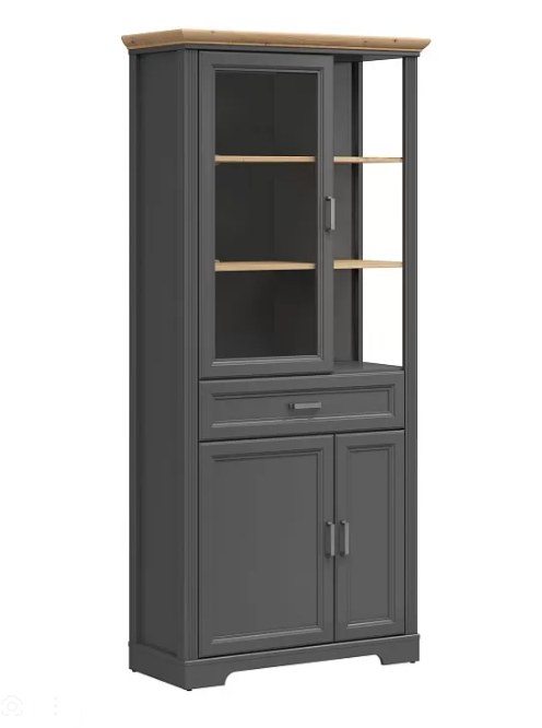 Шкаф с витриной Jasmin представлен моделью шириной 93 см и высотой 204 см. Уникальной особенностью этого комбинированного модуля является сочетание открытых и закрытых элементов. Вверху находится распашная дверь со стеклом толщиной 4 мм и открытая полочка для красивых вещей. Поставьте сюда сувениры и посуду, коллекционные вещи и декор.