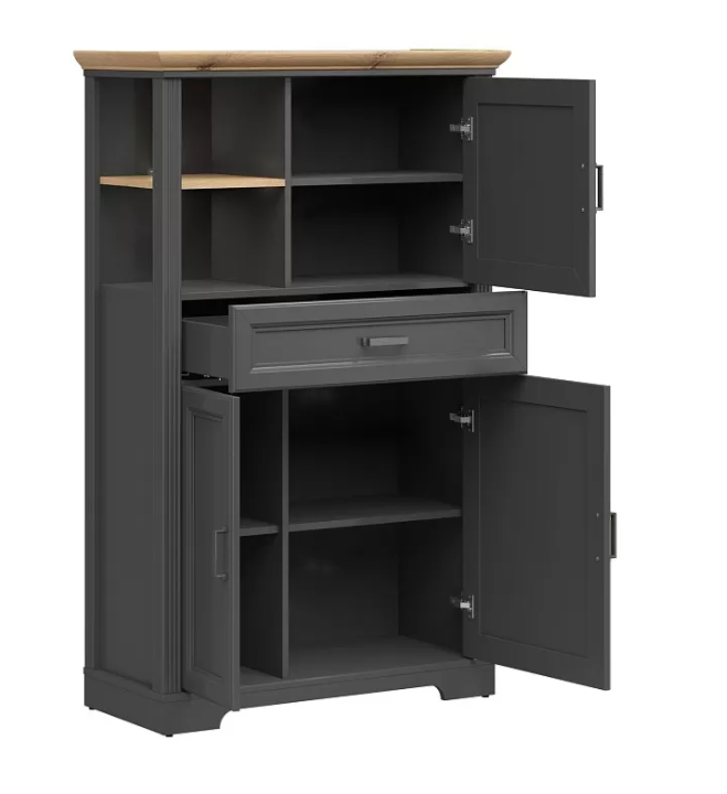 Шкаф Jasmin REG3D1S из ЛДСП класса Е1 и МДФ гарантирует безопасное пользование, а установленные петли с доводчиками – комфортную эксплуатацию. Эта модель продумана строго до мелочей. Его открытые полки идеально предназначены для хранения посуды и коллекционных вещей. За глухими дверями можно разложить домашнюю атрибутику – все то, что не должно пылиться и попадать под действие солнца.