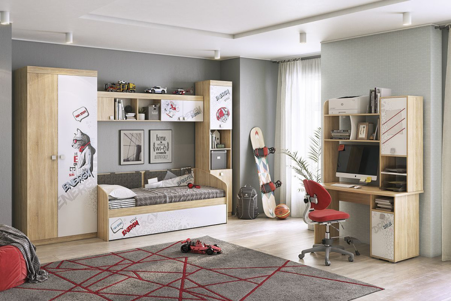 В нише и закрытой секции поместятся все учебники ребенка и обеспечат порядок на рабочем месте. Компактный и удобный прямой компьютерный стол из серии «Энерджи» может быть дополнен функциональной надстройкой. Главной особенностью данной коллекции являются современные принтерные рисунки.