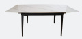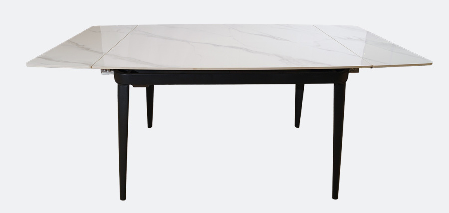 Обеденный раскладной стол Орта. Столешница выполнена из синтезированного камня - устойчивый, прочный и экологичный материал. Чуть закруглённые углы и белая матовая столешница - беспроигрышный вариант для любой гостиной. По бокам стола расположены дополнительные раздвижные элементы, которые увеличивают полезную площадь столешницы на 30 или 60 см в длину.
