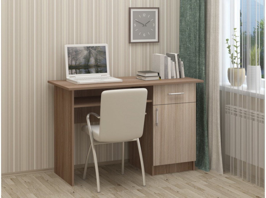 Письменный стол ПС-01 изготовлен из качественного ЛДСП, что гарантирует его долговечность. Стол состоит из столешницы, ящика и большого отделения с дверкой и одной полкой. Отлично подходит для комнаты школьника или студента.