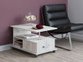 Перед вами интересный журнальный столик для гостиной. Он оборудован колесиками, благодаря которым его можно легко передвигать по комнате. Внутри столика расположен вместительный ящик и полка.