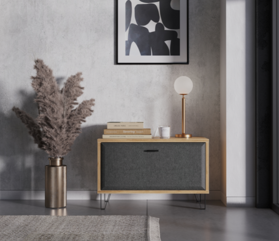 Благодаря газовому механизму европейского производства, откидная дверца плотно закрывается, тем самым защищает содержимое от пыли и намокания. Напольная тумба Grace изготовлена в Белоруссии из безопасных, износостойких материалов ЛДСП и МДФ. Благодаря нанесенной ламинированной пленке, ее каркас приобретает светлый оттенок дуба наварро, а фасад добавляет контраста в виде покрытия в цвете графит.