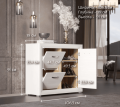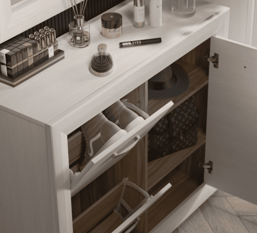 Тумба для обуви Malta – это полностью закрытая конструкция с одной распашной и двумя откидными дверцами. При разработке модели белорусские дизайнеры сделали акцент на вместительности и создали изделие высотой 91 и шириной 106 см. разные способы открывания позволят расположить обувь так, как удобно и требует конкретная ситуация. В такой тумбочке шириной 38 см разместятся сандалии и ботинки разного размера без ощущения скученности.