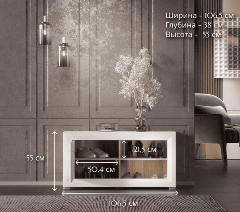 Обувная тумба Malta ‑ это вместительная модель шириной 106 см и высотой 55 см. Ее глубина составляет 38 см, что позволяет аккуратно расставить обувь разного размера. На открытых полках тумбы «Мальта» можно хранить ботинки и сандалии, которыми пользуетесь каждый день. За дверь будет разумно поставить сезонную обувь. Для этого здесь установлены 2 съемные полки.