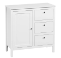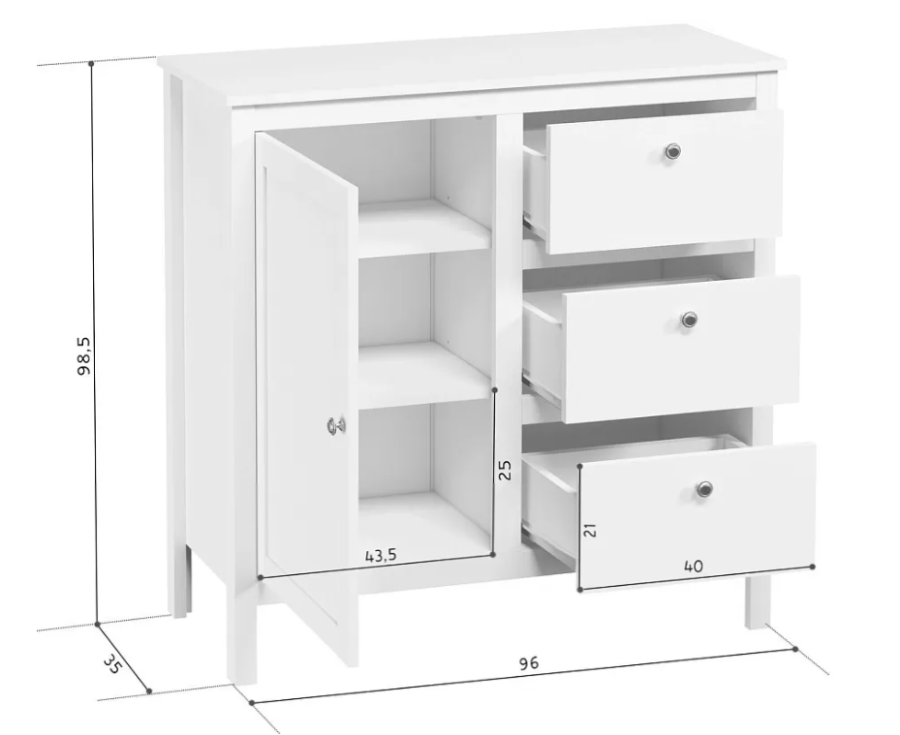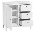 Напольная белая тумба серии Ewa (Helga) изготовлена в Белоруссии из надежных и недорогих материалов ЛДСП, МДФ, не уступающих в прочности натуральному дереву. Это сравнительно небольшая конструкция высотой 98 и шириной 96 см. С ее правой стороны расположены 3 ящика, слева находится распашная дверца и 2 полки внутри.