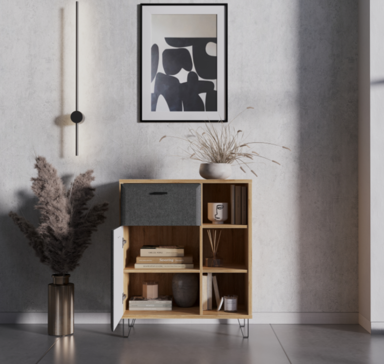 Напольный комод Grace – изюминка коллекции белорусского производителя BRW-мебель. Его отличает оригинальная конструкция, в которой распашную дверь гармонично дополняет ящик и открытое отделение. Модель с высотой 94 см, шириной 79 см и глубиной 41 см легко вписывается в небольшое пространство и создает вместительный блок для хранения вещей.