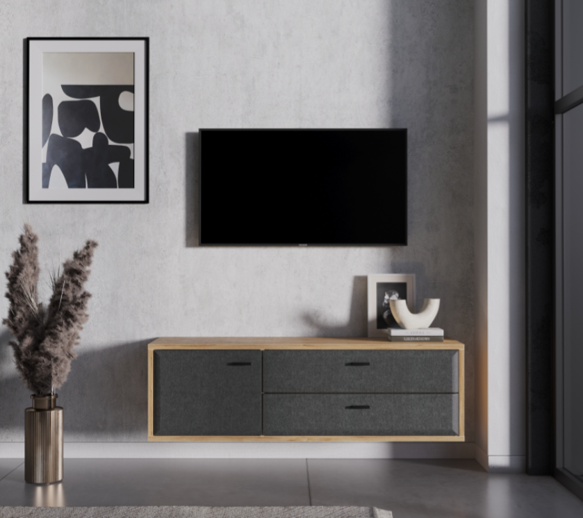 Навесная белорусская тумба Grace шириной 135 см и высотой 41 см компактно разместится на стене и станет прекрасной альтернативой ТВ-тумбе. Эта модель имеет горизонтальное расположение, два ящика и дверцу с полкой внутри. Ее поверхность в древесных тонах, оттененная графитовыми фасадами и черными прямыми ручками, гармонично вписывается в современные интерьеры.