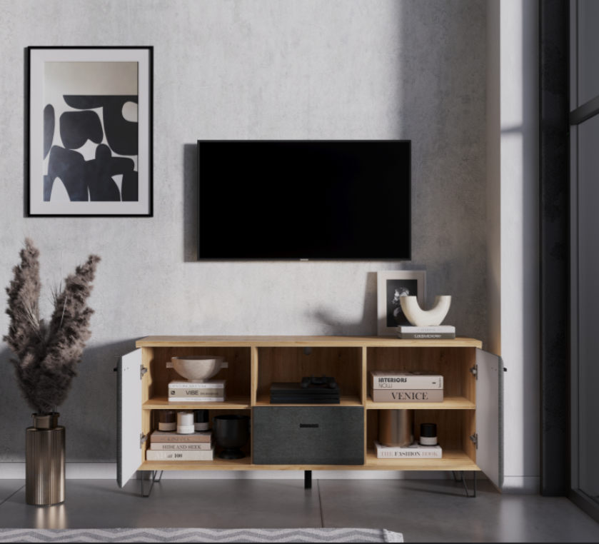 Коричневая тумба под ТВ «Грейс» изготовлена из ламинированной плиты ДСП в отделке МДФ. Ее фасады имитируют грубый бетон, а каркас олицетворяет тепло древесины, словно обожженной солнцем и представленной в самом приглядном виде. Ширина тумбочки составляет 143 см, а глубина – 41 см. Благодаря таким размерам, она отлично впишется в современную гостиную, кабинет или спальню любой площади и планировки.