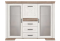 Тумба разделена на 4 отделения: 2 отделения с полками за распашными дверями со стеклянной вставкой, отделение в центральной части за откидной дверью, 3 выдвижных ящика на металлических роликовых направляющих;