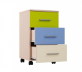 Габаритные размеры 404 х 680 х 418 мм. Тумба состоит из трёх взаимозаменяемых выдвижных ящиков, цвет фасадов – БЕЖЕВЫЙ, ЛАЙМ, СИНИЙ. Система выдвижения на роликовых направляющих длиной 350 мм позволяет полноценно использовать всю глубину тумбы. Задняя стенка, выполненная из Ламинированного ДСП, смещает центр тяжести, а так же детали, облицованные со всех видимых сторон, позволяют располагать тумбу в любом месте помещения. Тумба скомплектована колёсными опорами, что позволяет с лёгкостью передвигать её с одного места на другое. Для безопасности в процессе эксплуатации детьми, крышка комода облицована кромочным материалом толщиной 2 мм.