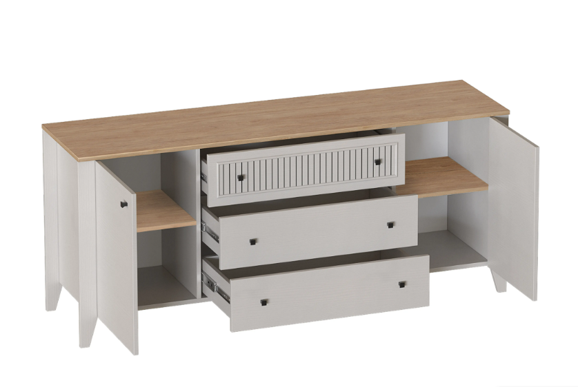 Тумба ТВ "Валенсия" выполнена в комбинации Дуб натуральный светлый / Персидский жемчуг и оснащена 3 ящиками на шариковых направляющих (без амортизаторов). Она выполнен из безопасных, качественных материалов, что гарантирует долговечность и сохранение первоначального вида на протяжении долгого времени.