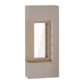 В верхней части изделия расположена горизонтальная дверь. Центральная часть состоит из открытой ниши с крючками и зеркалом и отделения с полками, расположенными за распашной дверью.
